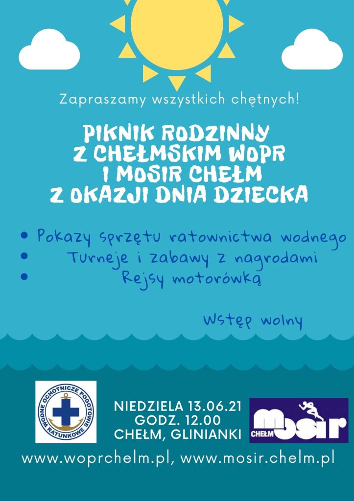 Już w najbliższą niedzielę tj. 13 czerwca 2021 r. odbędzie się PIKNIK RODZINNY Z CHEŁMSKIM WOPR i MOSiR Chełm!